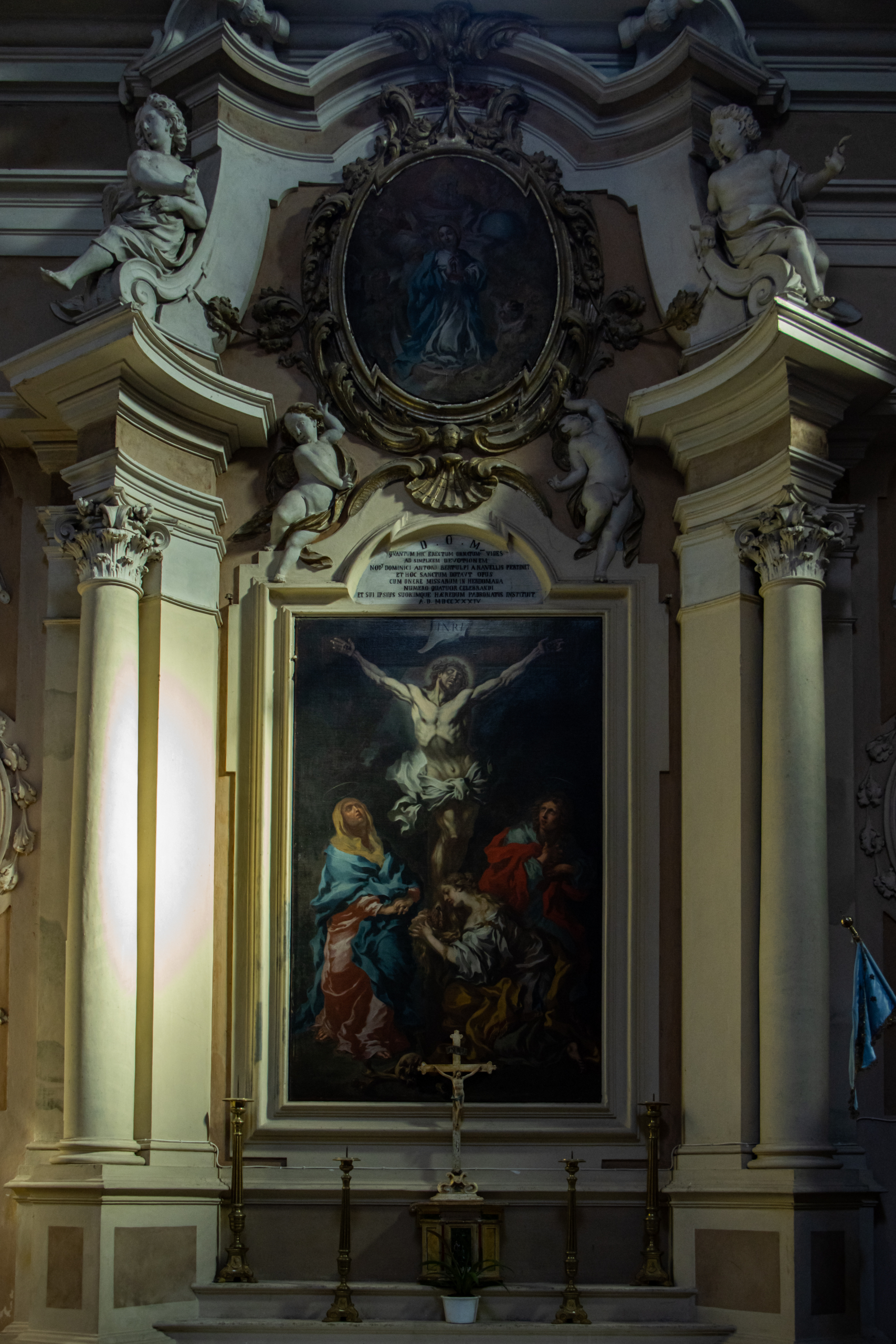 Sopra il portale, lo stemma civico col simbolo della nave, da cui si è creduto derivasse il nome Navelli. All’interno vi sono sei altari, arricchiti da dipinti e stucchi, oltre al monumentale organo del Fedri, datato 1782 e recentemente restaurato. Di particolare interesse, la grande pala raffigurante la Crocifissione, di impianto seicentesco. Alla chiesa è annesso l’oratorio della Confraternita del SS. Rosario, interamente in legno.